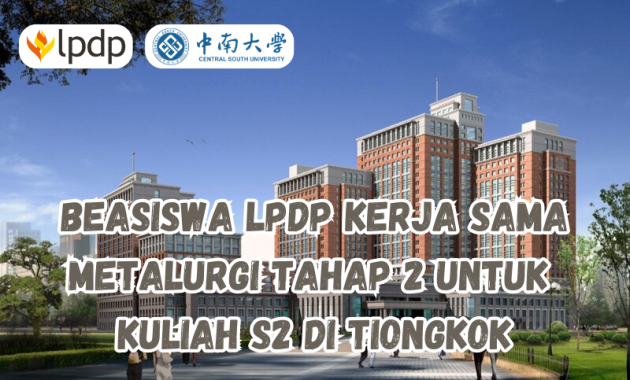 Beasiswa LPDP Kerja Sama Metalurgi Tahap 2 untuk Kuliah S2 di Tiongkok LPDP kembali lagi nih membuka peluang beasiswa, khususnya beasiswa program kerja sama di jurusan Metalurgi. LPDP kembali menggandeng Central South University di Tiongkok sebagai host university. Jadi, jika kamu ingin melanjutkan studi di jenjang S2, khususnya untuk jurusan… Read more“Beasiswa LPDP Kerja Sama Metalurgi Tahap 2 untuk Kuliah S2 di Tiongkok”