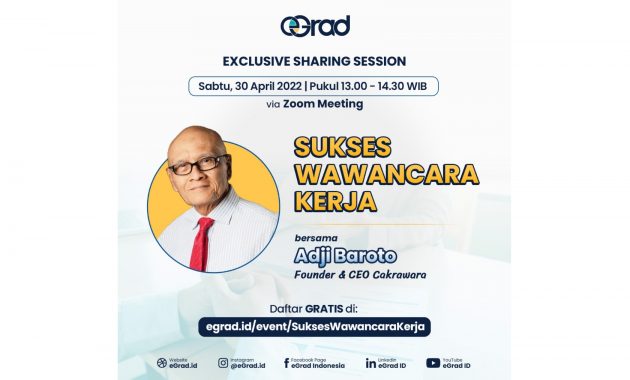 Penasaran bagaimana tips & trick supaya kamu bisa membuat impresi sebaik mungkin di hadapan recruiter? Bagi eGraders yang tertarik untuk mempersiapkan diri mengikuti wawancara kerja, mari ikuti Sharing Session mengenai “Sukses Wawancara Kerja“ bersama Bapak Adji Baroto founder @cakrawara.ig yang memiliki berbagai pengalaman dalam pengembangan diri SDM, dalam acara :
