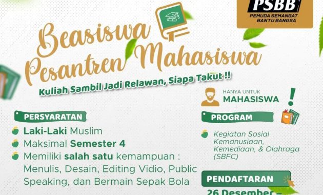 Beasiswa Prestasi Dompet Dhuafa Waspada Angkatan 31 untuk Mahasiswa S1 Sumatera Utara Dompet Dhuafa Waspada adalah lembaga milik masyarakat Indonesia yang bertujuan untuk memberikan batuan berupa zakat, infak, sedekah, wakaf, serta dana lainnya. Salah satu wujud penyaluran beasiswa ini adalah program beasiswa Prestasi. Beasiswa ini dikhususkan untuk mahasiswa S1 daerah… Read more“Beasiswa Prestasi Dompet Dhuafa Waspada Angkatan 31 untuk Mahasiswa S1 Sumatera Utara”