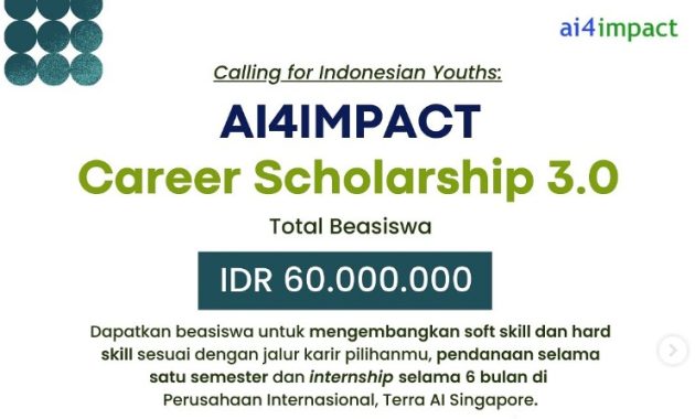 Halo pejuang beasiswa! Ai4Impact kembali membuka pendaftaran Ai4Impact career scholarship. Program ini kembali dibuka setelah melihat antusiasme pemuda Indonesia berpartisipasi pada program – program sebelumnya. Ai4Impact career scholarship juga melihat bagaimana pemuda Indonesia memiliki pontensi luar biasa dalam mengembangkan pengetahuan dan kemampuan untuk meraih kesuksesan karir. Program ini menawarkan program pengembangan diri baik di ranah soft skill maupun hard skill. Bagi kamu yang tertarik, berikut informasinya lebih lanjut. Untuk info beasiswa lain, silakan click disini.