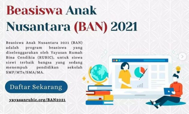 Yayasan Rumah Bina Cendikia atau Rubic kembali menghadirkan beasiswa, nih! Beasiswa kali ini bertajuk Beasiswa Anak Nusantara atau BAN. Kandidat yang dicari adalah pelajar SMP dan SMA yang berasal dari keluarga kurang mampu, serta memiliki prestasi akademik yang baik. Nah, buat kamu yang tertarik, berikut informasinya lebih lanjut. Untuk info beasiswa lain, silakan click disini.