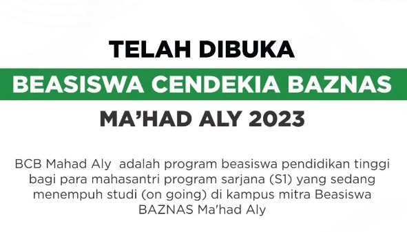 Kabar baik untuk pejuang beasiswa! Pasalnya, beasiswa Cendekia Baznas Ma’had Aly kembali membuka pendaftaran! Program ini bertujuan menyediakan dana pendidikan anak bangsa untuk menyiapkan pemuda agar memiliki kedalaman ilmu pengetahuan, akhlak yang luhur, unggul, dan berdaya saing. Program beasiswa Baznas Cendekia Ma’had Aly ditujukan kepada mahasiswa S1 yang sedang menempuh studi di kampus mitra Baznas. Jika kamu berminat, berikut informasinya lebih lanjut. Untuk info beasiswa lain, silakan click disini.