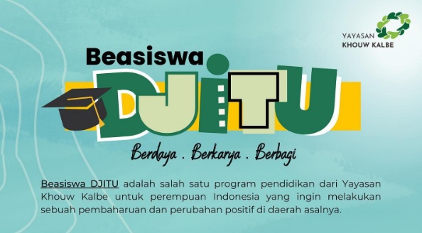 Yayasan Khouw Kalbe adalah sebuah yayasan yang bergerak di bidang pendidikan dan pemberdayaan perempuan khusus di daerah tertinggal. Salah satu perwujudan dari tujuan yayasan ini adalah diselenggarakannya Beasiswa Djitu. Beasiswa Djitu ditujukan untuk perempuan Indonesia yang berkeinginan untuk melakukan sebuah pembaharuan dan perubahan positif di daerah asalnya. Nah, bagi kamu yang berminat, berikut informasinya lebih lanjut. Untuk info beasiswa lain, silakan click disini.
