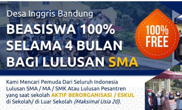 Kabar baik nih bagi kamu yang ingin memperdalam kemampuan bahasa Inggris, saat ini ada beasiswa 100% yang ditujukan kepada lulusan SMA loh. Beasiswa yang ditawarkan oleh Kampung Inggris Bandung ini akan memberikanmu kesempatan untuk mempelajari bahasa Inggris dengan metode-metode yang modern dan berfokus pada praktik. Program beasiswa ini akan berlangsung selama 4 bulan. Bagi kamu yang penasaran dengan info selengkapnya, yuk baca artikel berikut hingga selesai. Untuk info beasiswa lain, click disini.