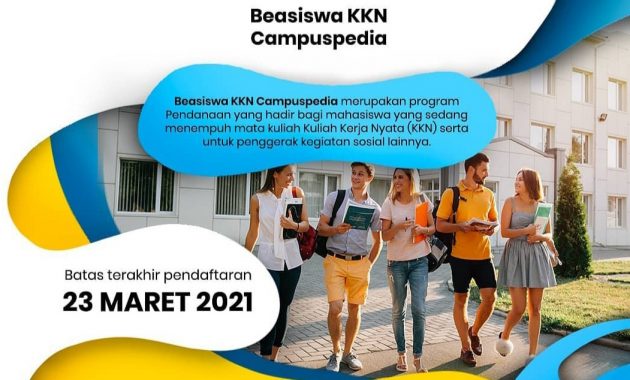 Campuspedia merupakan sebuah platform digital yang memiliki yang berfokus pada persiapan karir baik bagi siswa maupun mahasiswa. Di tahun 2021 ini, Campuspedia menghadirkan sebuah program baru yaitu Beasiswa KKN. Beasiswa KKN Campuspedia ini merupakan salah satu bentuk dukungan Campuspedia terhadap bidang pendidikan di Indonesia. Bagi kamu yang tertarik dengan beasiswa KKN ini, yuk baca info selengkapnya di bawah ini. Untuk info beasiswa lain, click disini.
