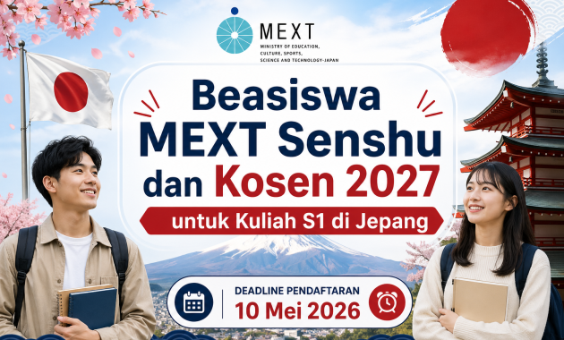 Ada yang ingin kuliah ke Jepang? Jika iya, maka kesempatan beasiswa ke Jepang ini patut kamu pertimbangkan. Beasiswa yang ditawarkan oleh Kementerian Pendidikan, Budaya, Olahraga, Ilmu Pengetahuan, dan Teknologi (Monbukagakusho/MEXT) pemerintah Jepang ini kembali membuka pendaftaran untuk periode perkuliahan di tahun 2027 untuk program Senshu dan Kosen. Jika kamu penasaran tentang beasiswa ini, yuk simak info selengkapnya di bawah ini. Untuk info beasiswa lain, click di sini.