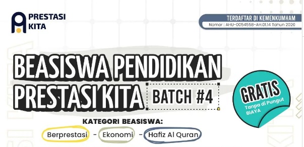 Hallo, pejuang beasiswa! Prestasi Kita kembali menyelenggarakan beasiswa, lo. Beasiswa ini disebut sebagai beasiswa Pendidikan Prestasi Kita Batch 4. Beasiswa Pendidikan Prestasi Kita Batch 4 memiliki 3 kategori, yaitu: berprestasi, ekonomi, dan hafiz Al-Quran. Bagi kamu yang berminat, berikut informasinya lebih lanjut. Untuk info beasiswa lain, silakan click disini.