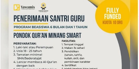 Yayasan Wakaf Minang Smart atau Yawamis adalah salah satu nonprofit organization berlokasi di Minang. Organisasi ini memiliki misi untuk menjadi platform peningkatan kapasitas pemuda dalam semua bidang, terutama bidang pendidikan dan Al-Qur’an. Saat ini, Yawamis sedang membuka pendaftaran beasiswa untuk pemuda muslim. Manfaat yang bisa kamu dapatkan, salah satunya adalah pelatihan skill mengajar. Lamanya beasiswa ini akan berlangsung dalam 6 bulan atau 1 tahun. Nah, jika kamu berminat, silakan baca informasinya lebih lanjut berikut ini. Untuk info beasiswa lain, silakan click disini.