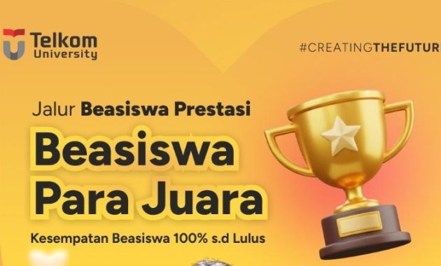 Telkom University kembali mengundang pelajar berprestasi untuk melanjutkan pendidikan melalui program beasiswa Prestasi. Program ini terbagi menjadi 2 kategori, yaitu beasiswa unggulan dan pintarkesempatan beasiswa. Kandidat terpilih nantinya berkesempatan untuk mendapatkan beasiswa 100% hingga lulus. Kandidat yang dicari adalah pelajar dengan prestasi akademik maupun non-akademik. Nah, bagi kamu yang berminat, berikut informasinya lebih lanjut. Untuk info beasiswa lain, silakan click disini.